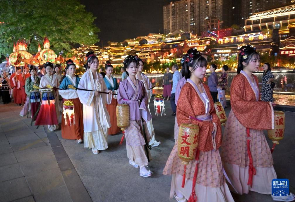 9月16日晚,在湖北省宣恩县城贡水河畔,人们身着传统服饰参加巡游活动。