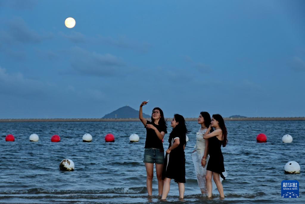 9月17日,在上海金山城市沙滩,人们在月下留影。